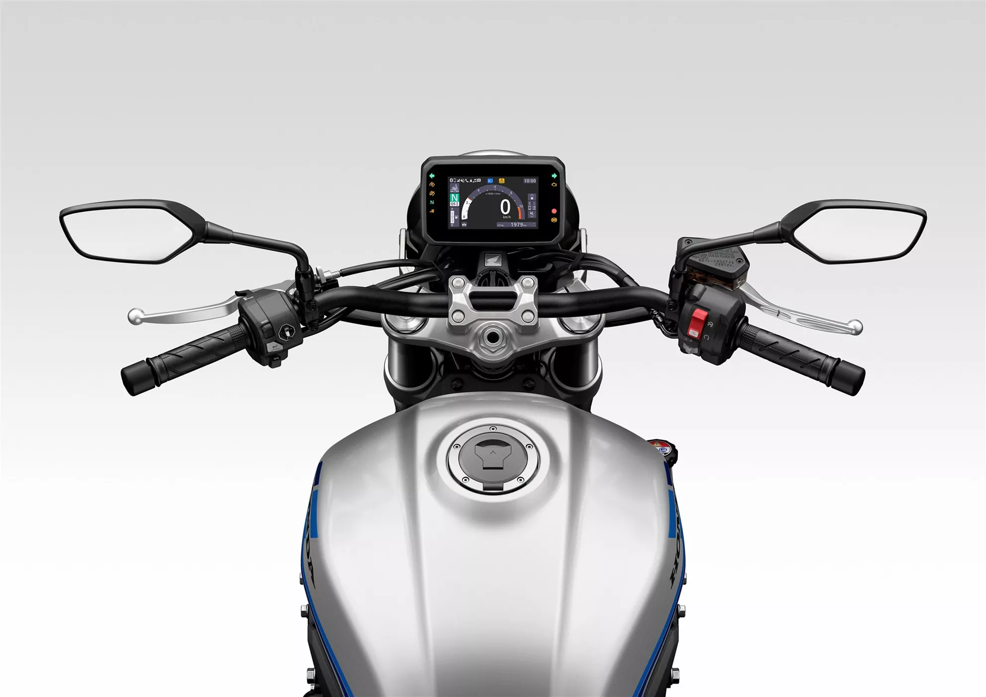 Die elektronische Ausstattung der CB1000F ist umfassend. Eine Sechsachsen-Gyroeinheit liefert Daten für Traktionskontrolle, Wheelie-Control und Kurven-ABS. Das Ride-by-Wire-System erlaubt die Auswahl zwischen drei Standard-Fahrmodi - Sport, Standard und Rain - sowie zwei frei konfigurierbaren User-Modi. Leistung, Motorbremse und Traktionskontrolle lassen sich jeweils in drei Stufen justieren. Über das 5-Zoll-TFT-Display erfolgt die Verwaltung der Fahrmodi, ergänzt durch intuitive Bedienung über den Vierwegeschalter am linken Lenkerende.
