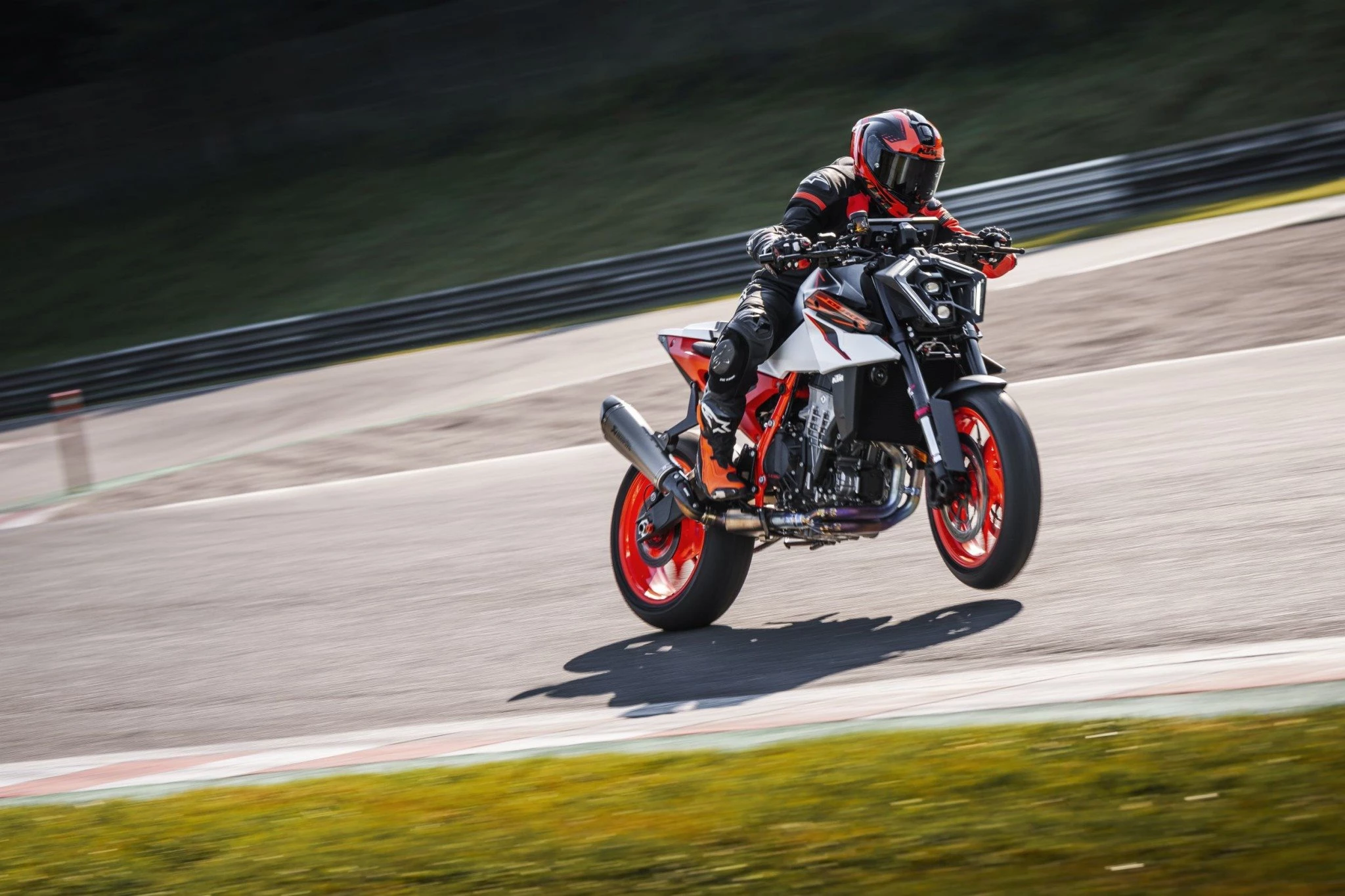 Vártunk rá, de végre megérkezett: A KTM 990 Duke R a jól ismert 990 Duke alapjaira épül, de minden lényeges területen átdolgozták. A 947 köbcentiméteres párhuzamos ikermotor immár 130 lóerőt és 103 Nm nyomatékot produkál, míg a súly 190 kilogrammra csökkent. Az új 9 hüvelykes érintőképernyős TFT Split-Screen funkcióval modern kezelést nyújt, a bővített vezetési és ABS-módok, mint a SPORT és SUPERMOTO+, pedig nagyobb személyre szabhatóságot tesznek lehetővé. Az átdolgozott futómű a teljesen állítható WP APEX villával és most már láncvezetéssel szerelt hátsó lengéscsillapítóval nagyobb precizitást és stabilitást ígér. A Brembo-Stylema rendszer 320 mm-es tárcsákkal váltja fel az eddigi fékkonfigurációt, ami jelentős fejlődést hoz a kezelhetőségben. A 990 Duke R dizájnja narancs árnyalatokat ötvöz matt fekete felületekkel, emlékeztetve a korábbi Super Duke modellekre. A szériaközeli prototípus a rövid teszten határozott visszajelzést, finoman hangolt futóművet és erős fékrendszert mutatott, bár a sportosság érdekében a kényelem háttérbe szorul.