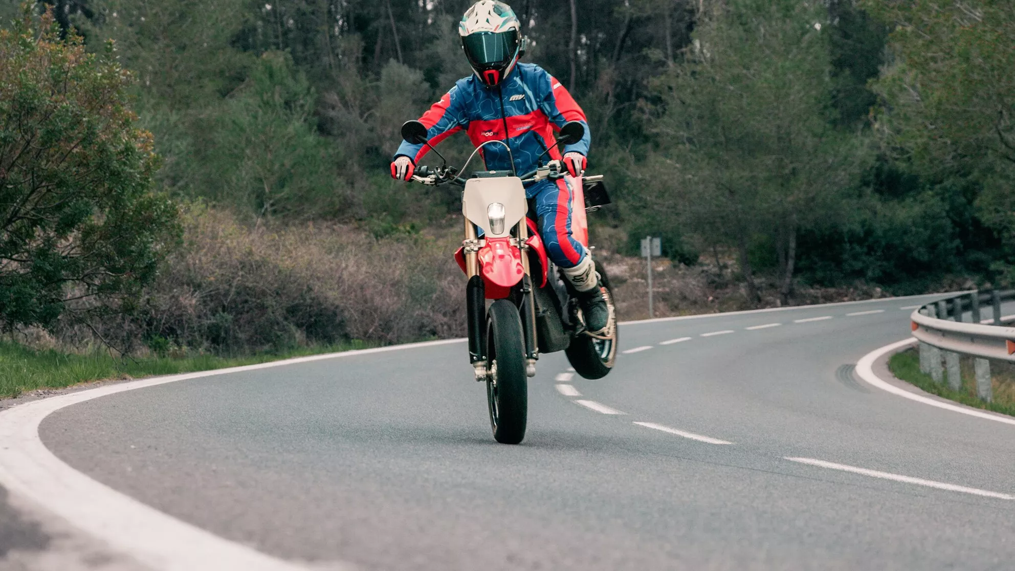 Zodra je op bochtige wegen komt, toont de Stark Varg SM haar ware gezicht – en dat is vooral uitdagend. De combinatie van laag gewicht en extreem directe vermogensafgifte zorgt voor een rijervaring die je niet kent van klassieke Supermotos. Al bij middelmatige vermogensniveaus wordt duidelijk hoeveel potentieel er in deze motorfiets zit. De kracht is vrijwel zonder vertraging beschikbaar, wat ertoe leidt dat het voorwiel sneller stijgt dan je verwacht. Precisie aan de gashendel is hier geen luxe, maar een noodzaak.
