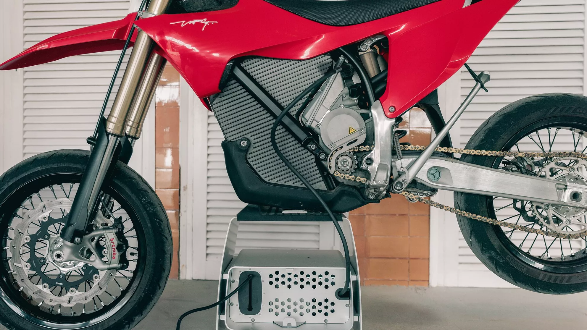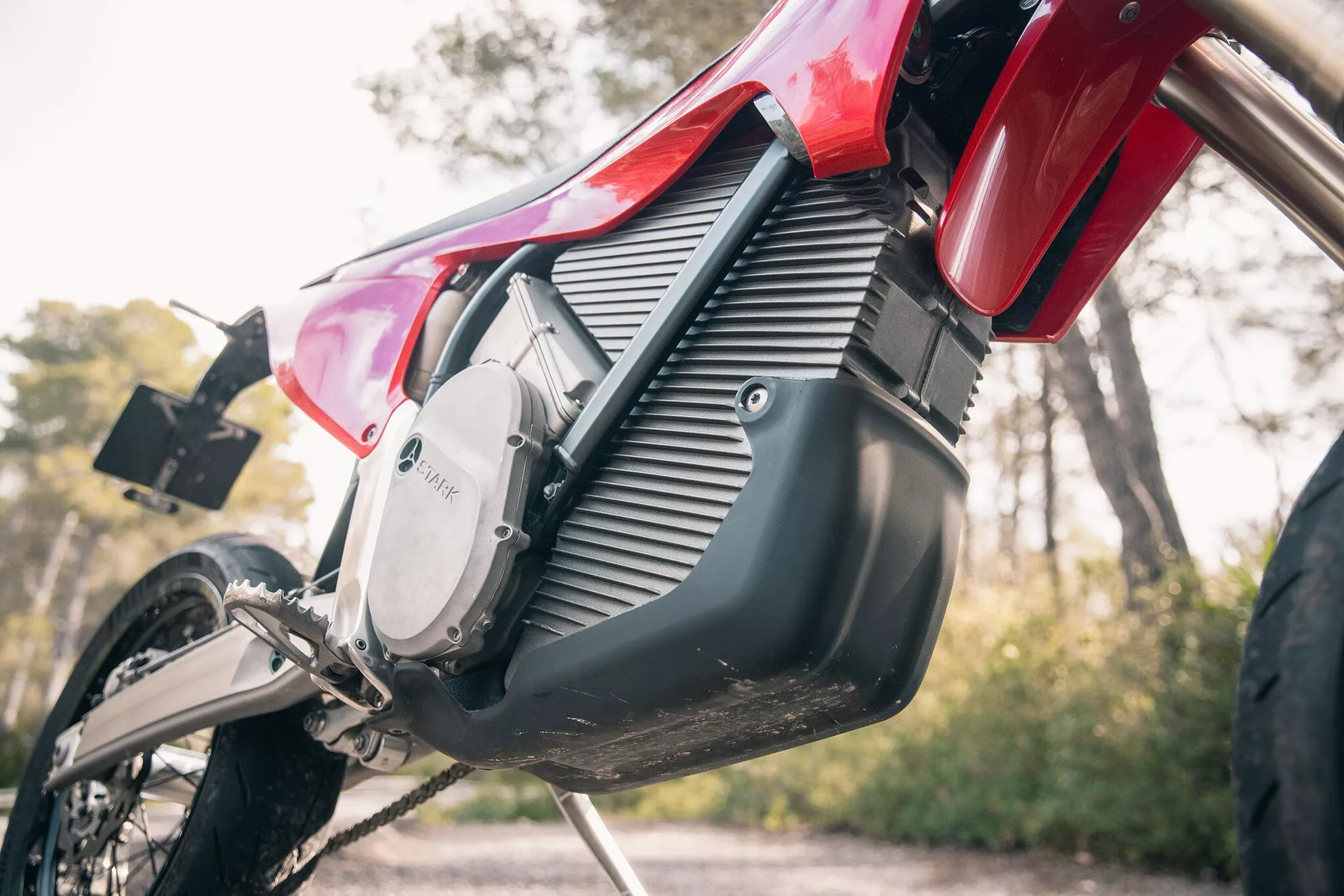 Het hart van de Stark Varg SM is een 7,2 kWh grote accu, die tegelijkertijd als structureel element in het voertuig fungeert en zo bijdraagt aan de stijfheid van het chassis. Het chassis komt van KYB en is volledig instelbaar, met 290 mm veerweg aan de voorkant en 303 mm aan de achterkant. Remmen gebeurt met hoogwaardige Brembo-componenten, met een radiale vierzuiger-klauw en een 320 mm schijf aan de voorkant. Het totale pakket is duidelijk gericht op prestaties.