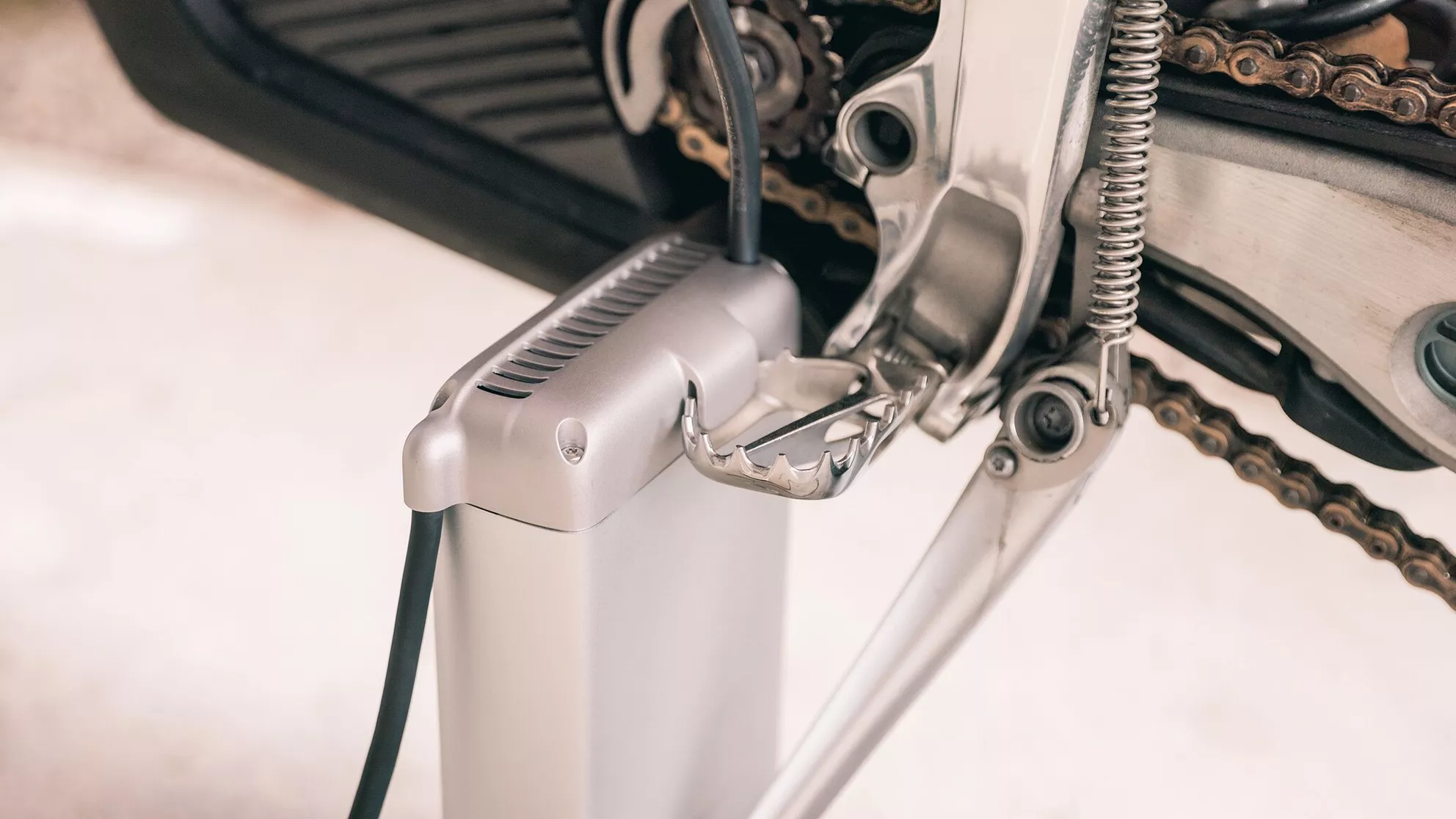 Elegant opgelost: De aluminium standaard van de Stark Varg SM fungeert ook als oplader.