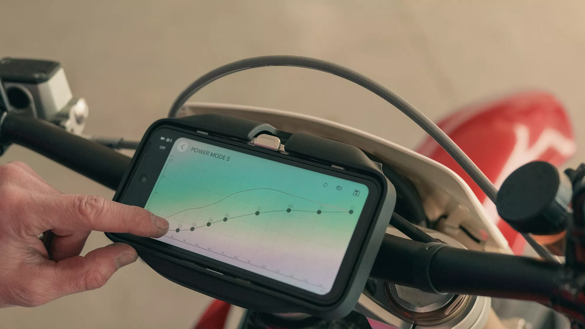 Er zijn vijf vermogensmodi op de Stark Varg SM. Wij hebben ze als volgt geconfigureerd: 10, 20, 40, 60 en 80 pk. Voor het vrijgeven van de volle 80 pk moet je 1000 € extra betalen en ontvang je daarvoor de zogenaamde "Alpha"-variant van de Varg SM. Zonder meerprijs stopt het bij 60 pk, maar zelfs die trekken al zo hard dat ik nooit naar niveau 5 schakel.