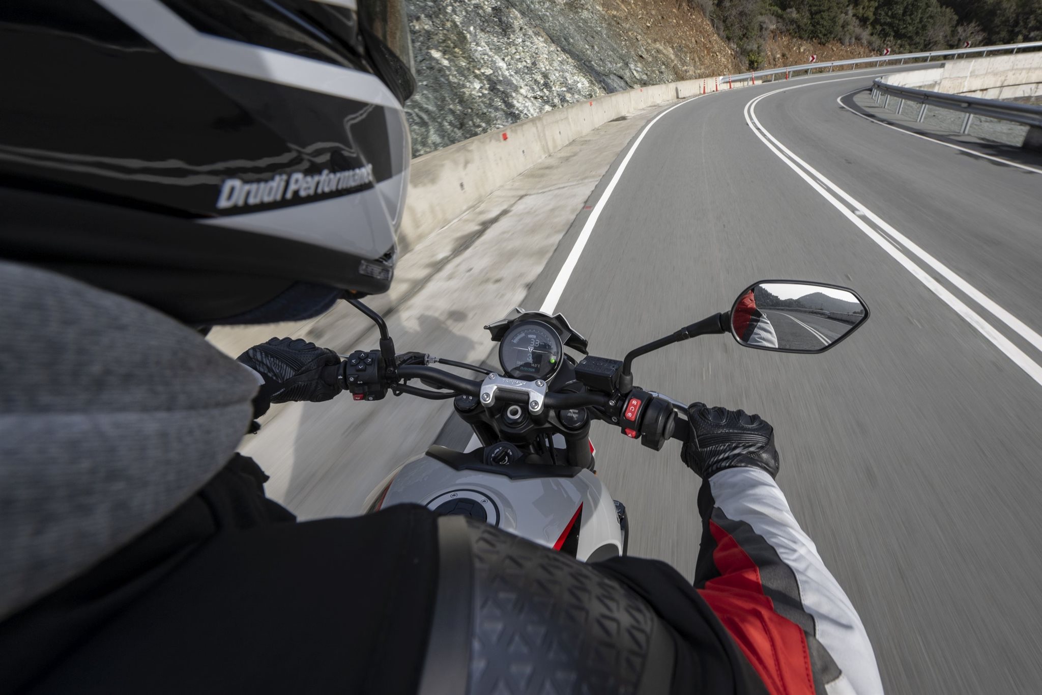 Na estrada, ela se mostra muito equilibrada. Você sente que, no fundo, continua sendo uma Trident aquela leveza familiar da 660 ainda está presente. Mas tudo está mais maduro: mais potência do motor, um quickshifter que funciona perfeitamente e de forma agradável, além de suspensão e freios que parecem mais desenvolvidos e adequados à moto. O resultado é uma motocicleta com a qual você pode se divertir sem precisar de grande adaptação. O som, especialmente o ruído de admissão, é particularmente impressionante. O escapamento fica mais em segundo plano, mas o som robusto das três borboletas de admissão é um destaque que contribui muito para o caráter da moto.