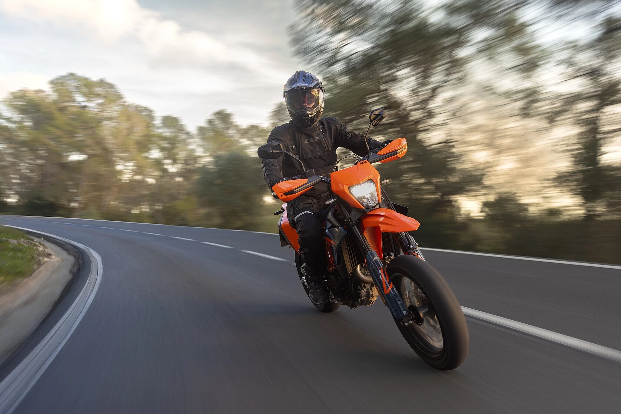 A KTM 690 SMC R oferece uma sensação totalmente diferente. Um monocilíndrico clássico, potente, mas sempre bem dosável. A entrega de potência é previsível, responde claramente aos comandos e transmite imediata confiança. É exatamente isso que a torna tão forte em uma pilotagem esportiva.